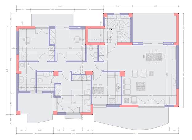 Floor plan with the vertical load bearing elements highlighted